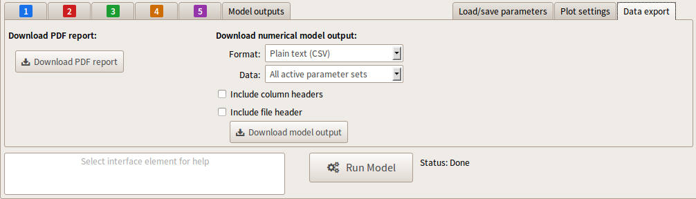 The PDF report contains the text output from the Model outputs tab (read more) together with the currently active plots (read more)